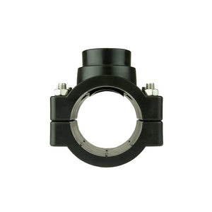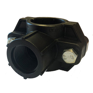 Philmac Rural B Tapping Saddles are used to make a 'T' connection. The saddle is placed around the pipe and bolted together, a hole is then drilled through the opening in the saddle and a male BSP threaded fitting is attached to the saddle.